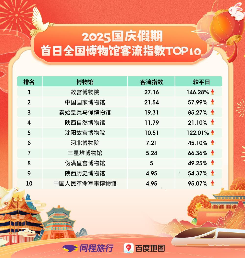 假期首日,全国各地博物馆的热度在各类文旅消费主题中位居前列。根据百度地图的客流量数据和同程旅行平台的搜索预约数据,假期首日热度较高的博物馆主要有:故宫博物院、陕西历史博物馆、中国国家博物馆、秦始皇兵马俑博物馆、陕西自然博物馆、沈阳故宫博物院、河北博物院、三星堆博物馆等,其中,故宫博物院的客流指数较平日增幅高达146.28%。另外,苏州博物馆、南京博物院、洛阳博物馆等在长假期间的参观档期直至中秋节前后一直处于约满状态。