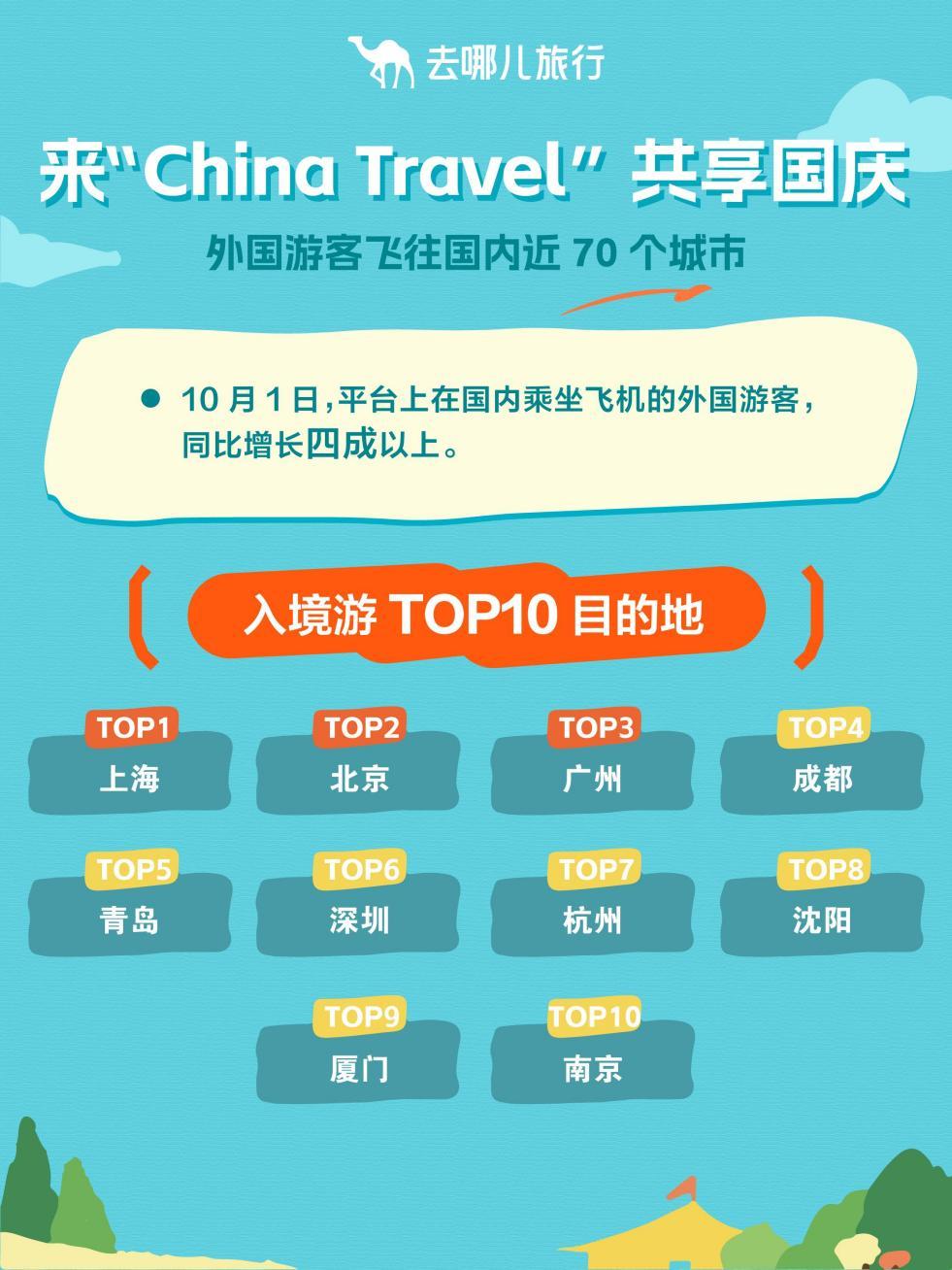 国内长假火爆,入境体验中国的海外游客也同样火。去哪儿数据显示,10月1日,平台上在国内乘坐飞机的外国旅客数量同比增长四成以上,飞往了国内70个城市。入境游Top10目的地城市是:上海、北京、广州、成都、青岛、深圳、杭州、沈阳、厦门、南京;Top5客源国是:韩国、日本、马来西亚、新加坡、泰国。